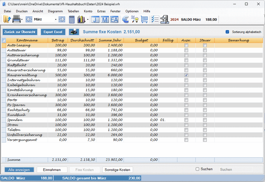 Einnahmen, Ausgaben und Saldo mit zusätzlicher Anzeige Durchschnitt und Summen Jahr.