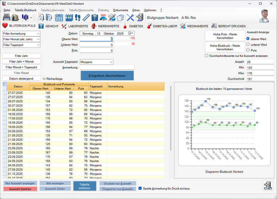 Register Blutdruck Max-, Min- und Durchschnittswerte