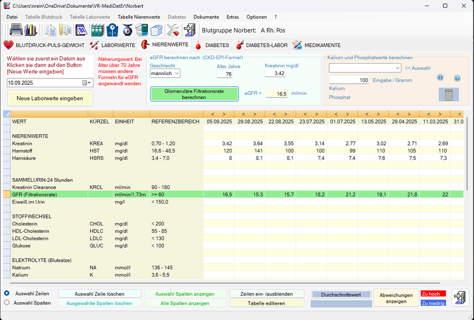 Im Register „Nierenwerte“ werden spezielle Laborwerte wie z. B.: Kreatinin, GFR, Kalium, Phosphat usw. erfasst. Der Kalium- und Phosphat-Gehalt von bisher etwa 150 erfassten Lebensmitteln kann ermittelt werden.