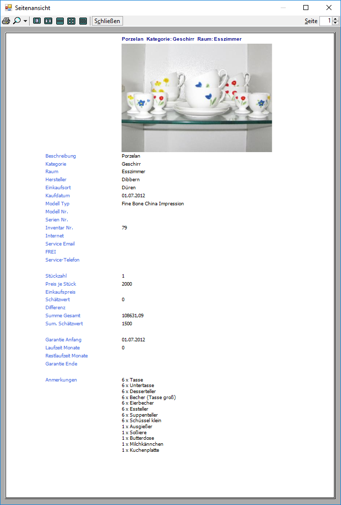Programm zur Verwaltung von Hausrat, Inventar oder ähnlichen Artikeln. Erfassung und Verwaltung des gesamten Hausrats, sowie Berechnung der Versicherungssumme für Ihre Hausratversicherung. Erfassung von Teilsummen eines Raumes, einer Kategorie oder einer beliebigen Auswahl von Datensätzen. Ermitteln Sie zum Beispiel den Wert aller Elektrogeräte oder aller Kunstgegenstände. Übersichtliche Darstellung aller eingegebenen Eigenschaften eines Artikels auf einer Bildschirmseite. Zur schnellen Erkennung des Artikels kann der Übersicht ein Bild, Grafik oder ein Foto hinzugefügt werden. Dieses Vorschaubild ist verknüpft mit den zugehörigen Dokumenten wie Rechnungen oder Garantie - Urkunden. Zusätzlich zur Hauptübersicht finden Sie verschiedene tabellarische Darstellungen der erfassten Artikel. In den Tabellen können Sie alle Datensätze anzeigen oder nur die Artikel eines Raumes bzw. einer Kategorie. Die Datensätze können nach Räumen, Kategorien oder Beschreibung gefiltert und zusätzlich nach verschiedenen Kriterien sortiert werden. Die integrierte Suchfunktion ermöglicht eine Filterung nach beliebigen Wörtern und Teilwörtern. Zu den vorgegebenen Räumen und Kategorien können weitere neue Kategorien und Räume hinzugefügt werden. Je nachdem, welche Artikel verwaltet werden, können Räume zugleich auch Schränke, Schubläden, Kartons oder ähnliche Behältnisse sein. Die erfassten Artikel können nach Excel und CSV exportiert werden. Es können Listen oder einzelne Datensätze mit Bild gedruckt werden. Per Mausklick ausgewählte und zusammengefasste Datensätze drucken. Nach vorgegebenen Kriterien gefilterte Datensätze drucken. Alle Druckaufträge können vor der Druckausführung über eine Druckvorschau betrachtet und geprüft werden.