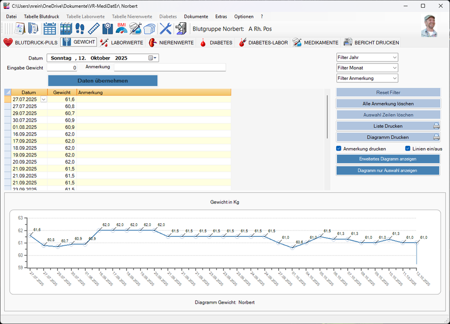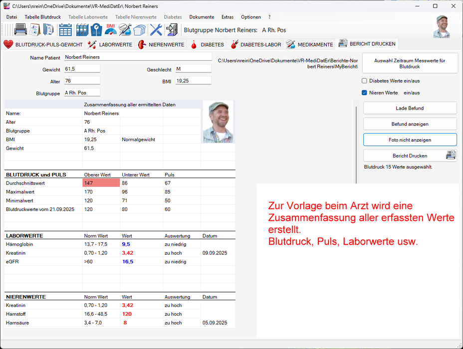 Programm zur Erfassung und Verwaltung von medizinischen Daten wie Laborwerte, Blutdruck, Puls, Gewicht, Blutzucker, HbA1c-Wert, med. Termine, Krankenberichte, Befunde usw. Register für Laborwerte allgemein und speziell für Diabetes und Nierenkranke. Grafische Auswertung der erfassten Daten. Abweichungen von Normalwerten können optional farblich hervorgehoben werden. Im integrierten Terminkalender verwalten Sie Arzt- und Zahnarzt-Termine, anstehende Operationen und ähnliche medizinische Termine wie z.B. Massagen, Gymnastik, Vorsorgeuntersuchungen, Kuren, Impfungen, Zahnreinigung oder Zahnsteinentfernung. Beinhaltet Modul zum Verwalten von medizinischen Dokumenten, Arzt- und Krankenhaus-Berichten oder Labor-Daten und vieles mehr. Erstellen Sie einen Medikamenten-Plan oder ermitteln Sie Ihren BMI (Body-Maß-Index). Alle erfassten Werte können übersichtlich als Diagramm dargestellt werden.